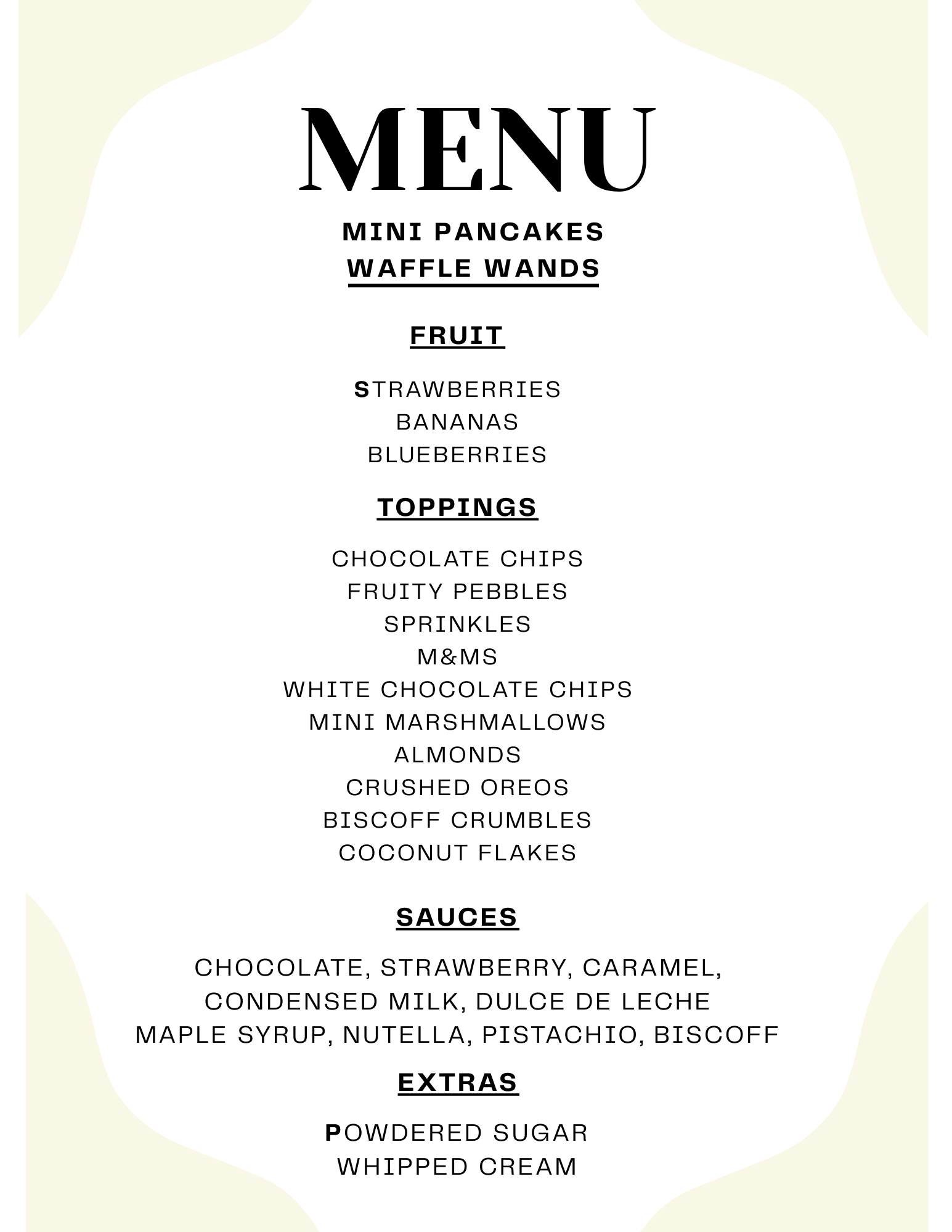 Our menu is designed to be simple, elevated, and crowd-pleasing. Each Tiny Flips experience includes a curated selection of toppings and sauces, chosen based on your event package and guest count.